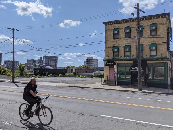 The second and more widespread response has been to shoehorn pedestrians, bikes, and buses into spaces designed exclusively for cars. That’s how you get a new crosswalk at the intersection of 57 and John Glenn, bike lanes on the shoulders of the Onondaga Lake Parkway, and buses that loop through the parking lots of strip malls in the suburbs.
