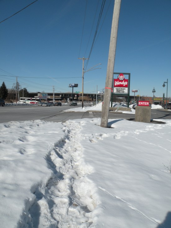 Even where there are sidewalks, they don’t go where people need them. The streets around the Market and RTC are all designed for cars not people. They’re too long and too circuitous, taking people way out of their way to get where they’re going. That’s not much of a problem when you’re driving a car, but it’s a huge hassle on foot—why walk an extra hundred feet along a curving driveway when it’s a straight line from the bus stop to the bus station? There’s no good reason, so people don’t, and so they end up having to walk through more snow because no one ever gave serious thought to making life easier for people who get around on foot.