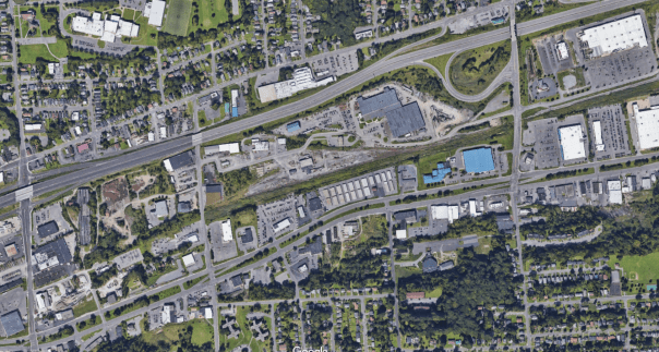 But it’s a real challenge to make those kinds of businesses ‘fit’ into the neighborhoods that need them. Erie Boulevard has a hardware store, a post office, a pharmacy, a bank, multiple restaurants, three (!) grocery stores, and specialized retail like a local guitar store and bike shop all within a mile’s walk, but most of those businesses are huge, set back behind mammoth parking lots, flanked by and dependent on 690. People in Eastwood might want to be able to walk to the grocery store, but they sure as hell don’t want Price Chopper’s 3.75 acre parking lot with all of that car traffic and those glaring floodlights anywhere near their houses. On the flipside, Erie Boulevard is so choked with asphalt that there isn’t any room for anybody to live nearby all those businesses.