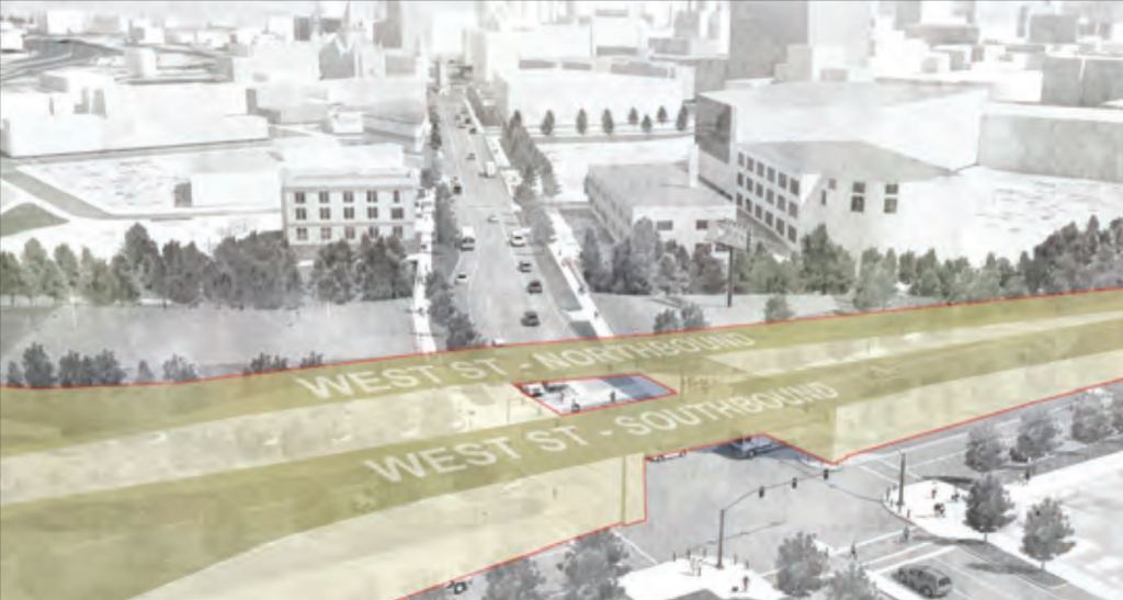 The thing is, this quasi-loop won’t make much sense after the viaduct’s gone. Harrison and Adams are 4 lanes wide because they handle all of the car traffic going to-and-from 81’s main Downtown exit. Pretty soon, that exit won’t exist, and those streets won’t get nearly enough traffic to justify their width. And if Harrison and Adams aren’t going to feed the interstate anymore, then it doesn’t make very much sense for West Street to feed them either, so it doesn’t need to be 6 lanes wide.