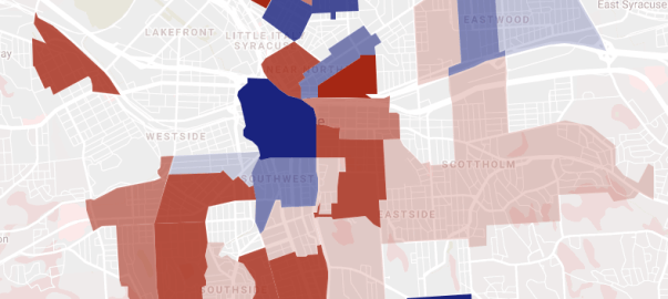 It’s an open question whether these trends will continue. In the parts of the City where kids are a growing share of the population, most of the growth (84%) came from census tracts where the population of children ages 0-5 (below school age, yellow on the map) outpaced the population of children 6-17 (school age, blue on the map). This increase in the proportion of young families could be a very good thing for Syracuse if it means that the City is gaining a stable cohort of long-term residents. But the increasing percentage of children below school age in growing neighborhoods could also signal something very bad—that families in growing neighborhoods are leaving the City when their kids start school.