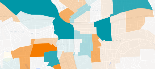 Combine those two measures—total number of households and total number of housing units—and you get the vacancy rate: the percentage of unoccupied housing units in an area. This map shows census tracts where the vacancy rate decreased in red, and those where it increased in brown. So much of the map is lightly shaded because changes in the number of households and housing units tracked pretty well across most of the city—where new families moved, new housing was built, where families left, housing was demolished. The City’s built environment adapted to its changing demographic reality.