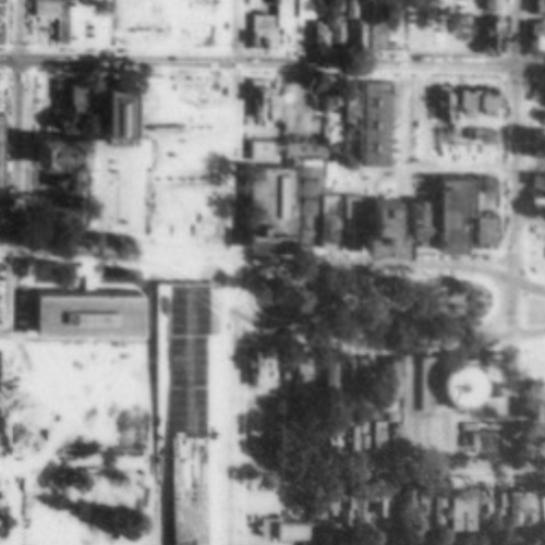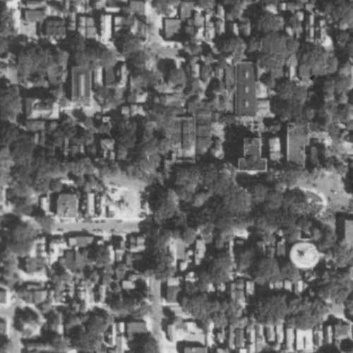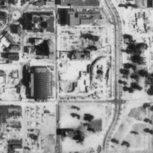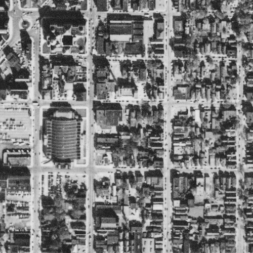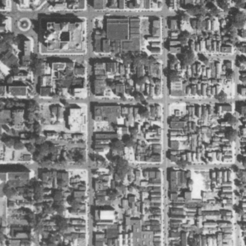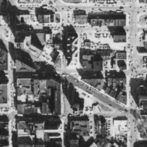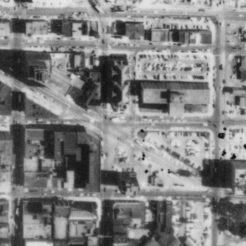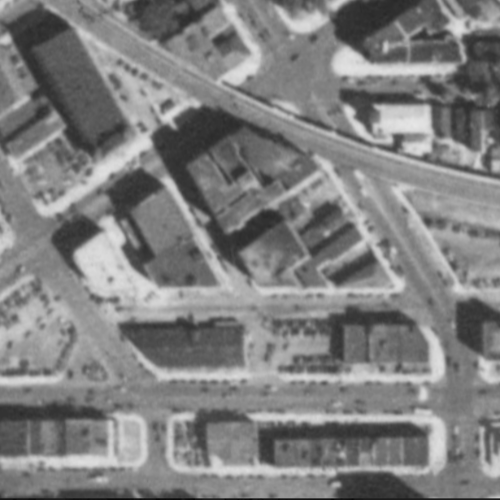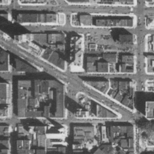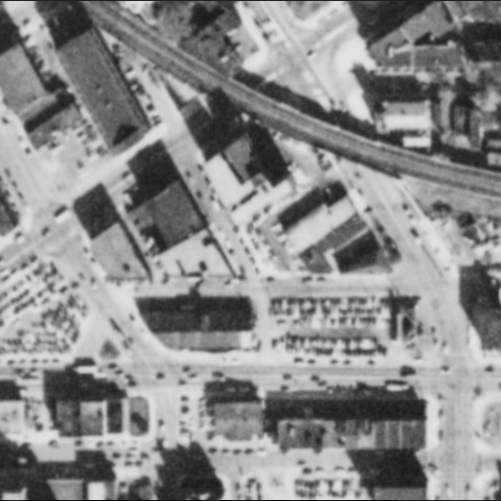 But even through the interchange wouldn’t destroy these blocks until the 1960’s, the car had already started degrading the area by 1951. Compare the image from that year (second in the series) to the one from 1938 (first in the series). A handful of buildings and some green space from the 1938 image are gone just 13 years later, all replaced by surface parking lots.