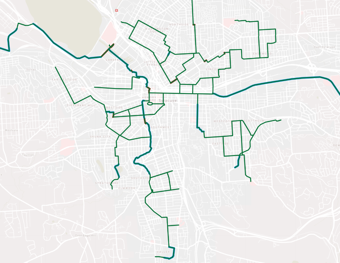 The blue highlights indicate where a route is fully separated from regular traffic. This includes both intentional bike infrastructure like the Canalway Trail on Erie Boulevard and also unintentional infrastructure like Fowler’s parking lot connecting Marcellus and Magnolia Streets.