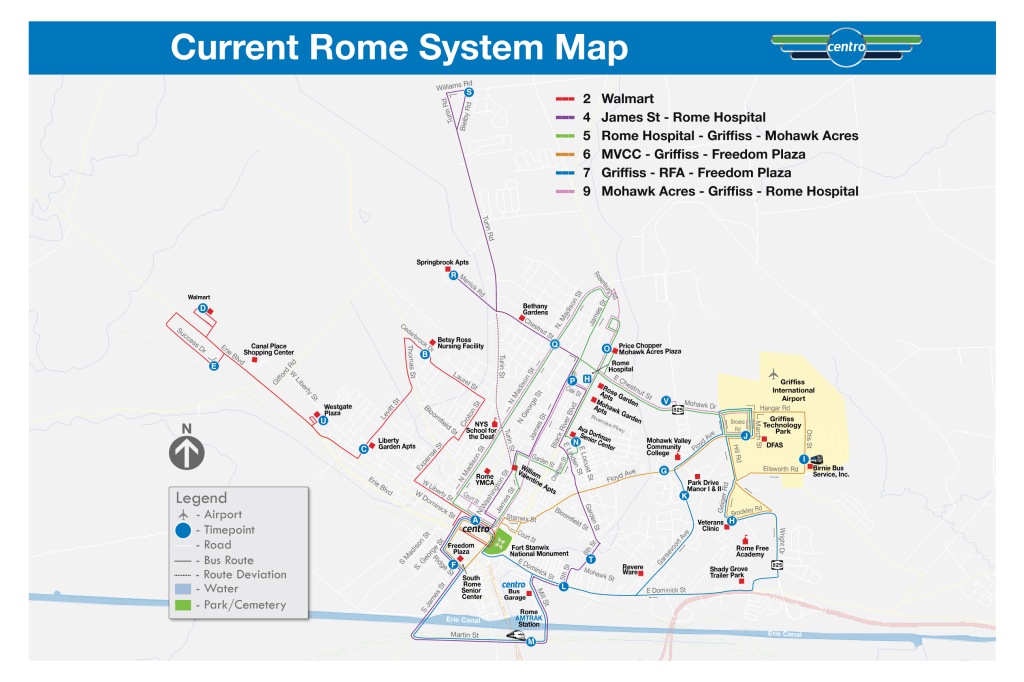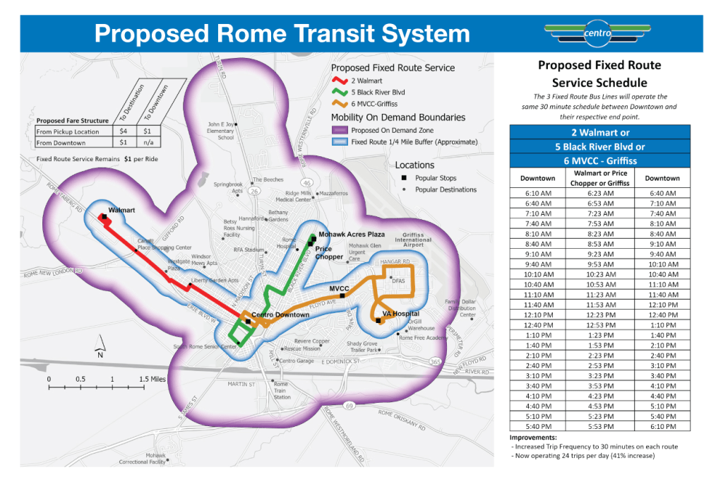 Centro’s newly announced service update for Rome offers a glimpse of how the transit authority might improve service in Syracuse. Rome’s new network features higher service frequencies on high-ridership routes, a clockface timetable, and on-demand service to cover lower-ridership areas.