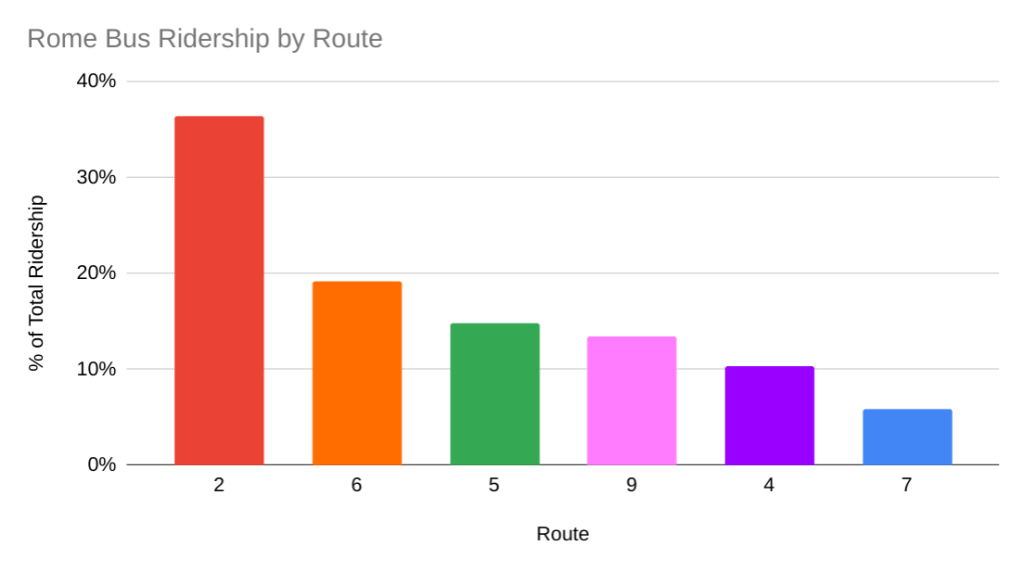 Centro currently runs six bus lines in Rome. The routes with the highest ridership (accounting for more than half of all trips in the network) are the 2 and 6 buses. The next two highest performing lines (providing more than 1 out of every 4 rides) are the 5 and 9 buses. The two lowest performing routes (carrying fewer than 1 of every 6 passengers) are the 4 and 7 buses.