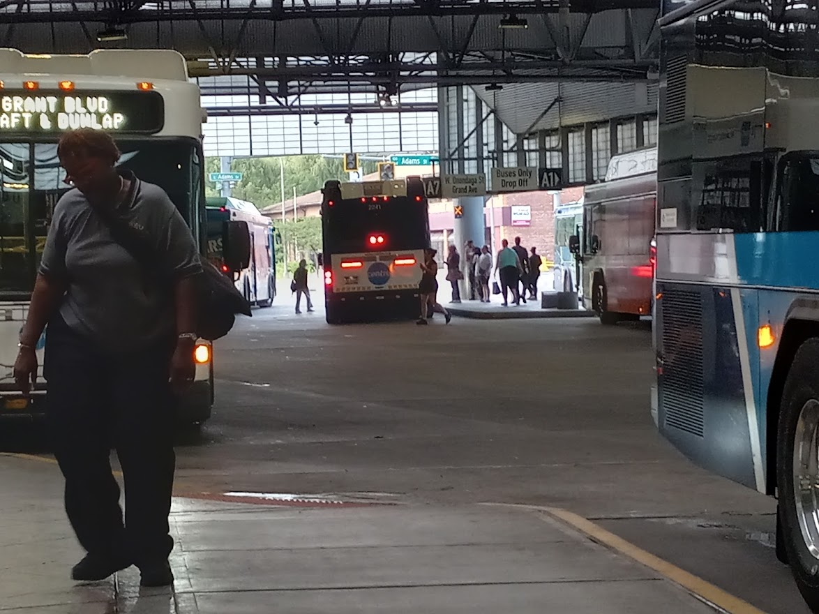 A lineup is when multiple buses—as few as 8 and as many as 20, but usually about 15—arrive at the Hub, layover, and then depart simultaneously. It’s an impressive sight as buses pull in one after another, riders speedwalk between connections, operators trade off shifts, and then all the buses leave together with a cacophony of honking, shouts, and revving engines. If you’ve ever seen a row of buses running north up Salina or State Streets, that’s the immediate aftermath of a lineup. On Centro’s current reduced (since 2021) service, 89% of runs begin at one of the 31 daily lineups. They are the organizing principle of Syracuse’s transit network.