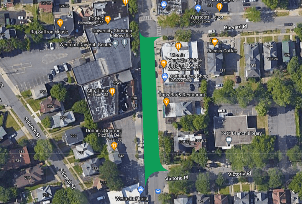 Westcott Street is both a destination and a through-route. A lot of the traffic on Westcott is definitely bound for the business district and wouldn’t be particularly affected by pedestrianizing a single block. But Westcott is also part of a north-south route that links Teall Avenue, 690, and Colvin Street, so a lot of car drivers on Westcott Street are on their way somewhere else, and turning a portion of that route into better public space would change their behavior.