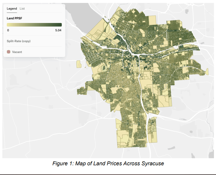 The Center for Land Economics recently published a study of how a hypothetical land value tax would affect tax rates in Syracuse. It found that most tax increases be downtown while the highest share of tax decreases would occur in the south and west sides. They also published this really interesting map charting land values in the city.