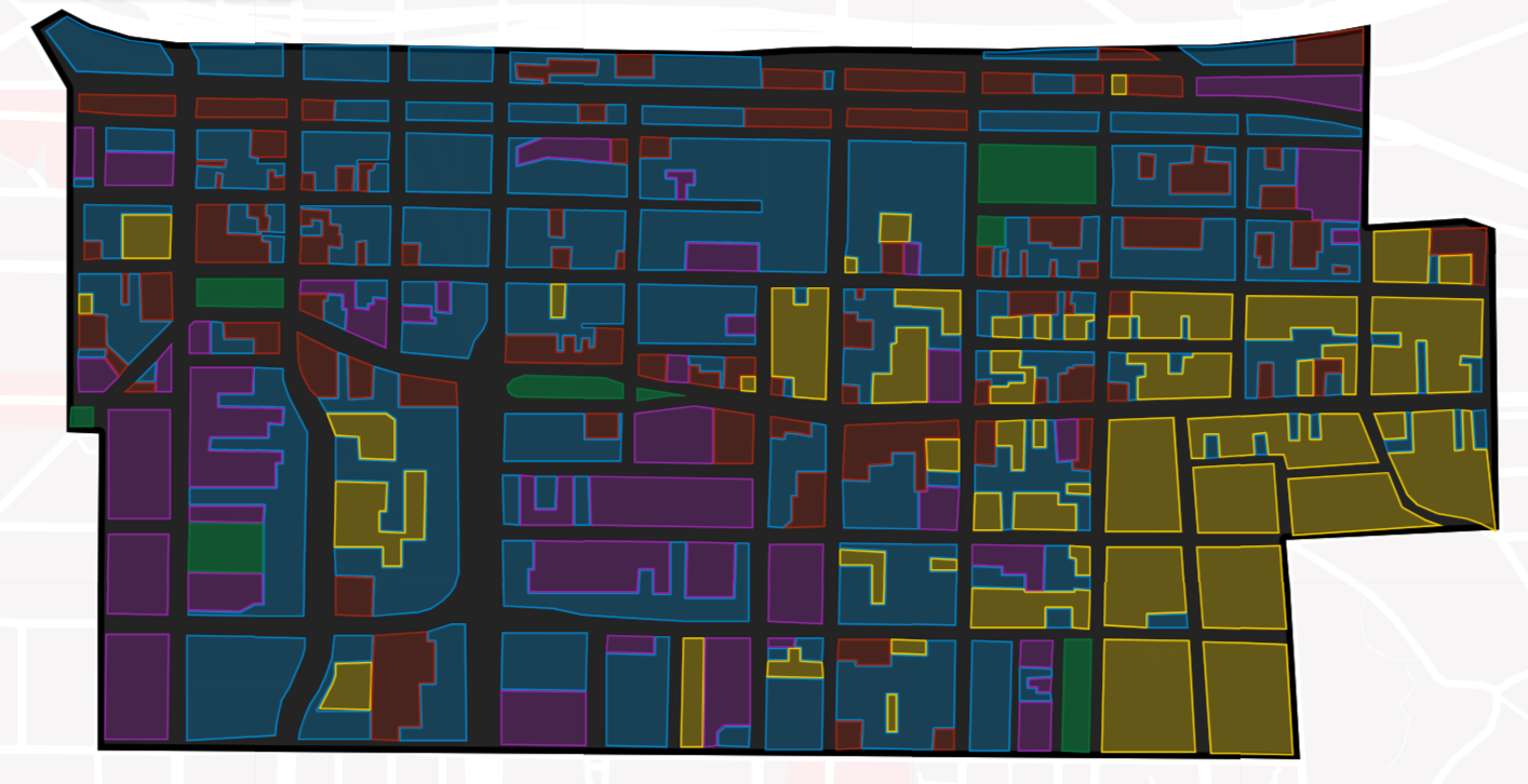 These maps show how land uses changed just east of Downtown between 1953 and 2021. Areas shaded yellow are housing (including mixed-use buildings), red are commercial, purple are institutional (churches, schools, hospitals, etc), blue are parking and vacant land, and green are parkland.