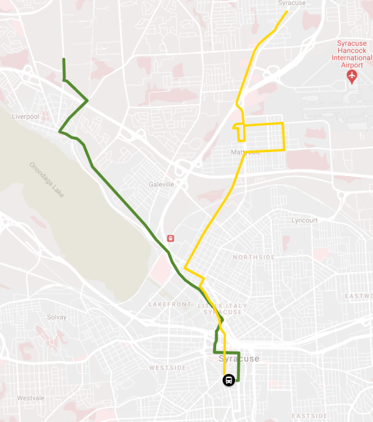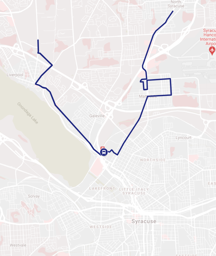 To see why, look at current service in the northern suburbs. Say you want to get from North Syracuse to the Amazon warehouse in Liverpool—a distance of about 5 miles if you were to walk it. It’s possible to make that trip on a bus, but you have to go all the way Downtown to make a connection at the Hub. That more than triples the length of the trip, and an easy 10 minute drive stretches into an hour-long bus ride.