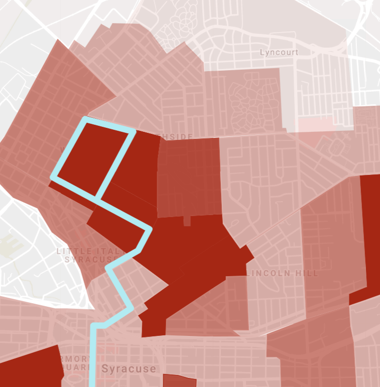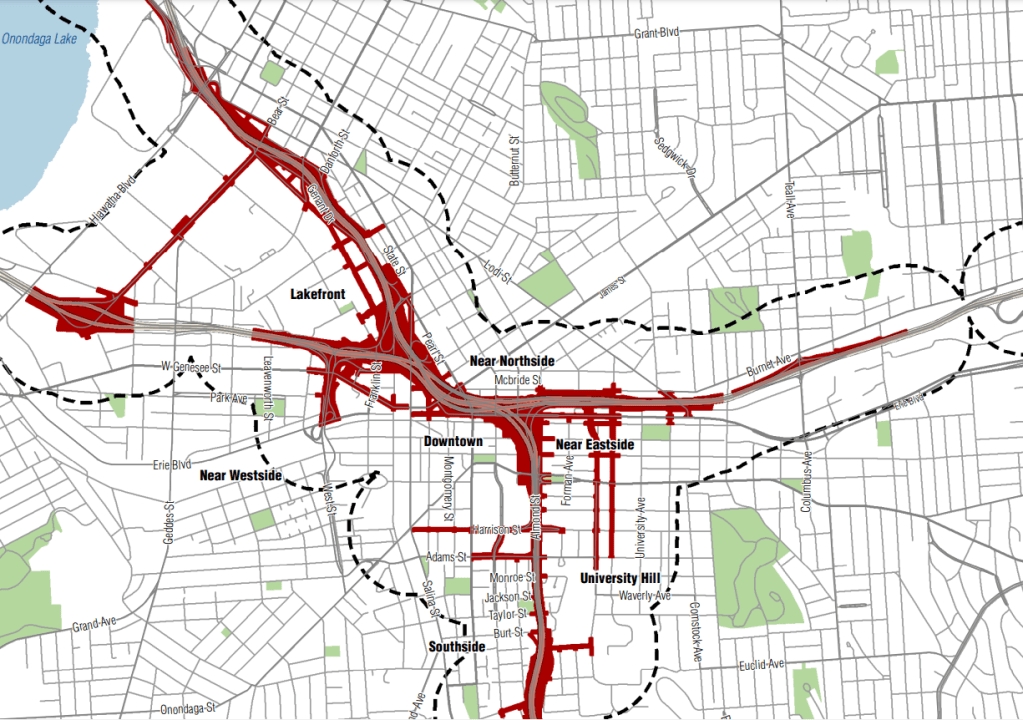 Several potential BRT stations are located within the I-81 project area. One of the most important is the small park at the intersection of Butternut, North Salina, and North State Streets. That’s where two BRT lines will converge, and a station on that park would allow riders to transfer between those lines without the need to cross the street.