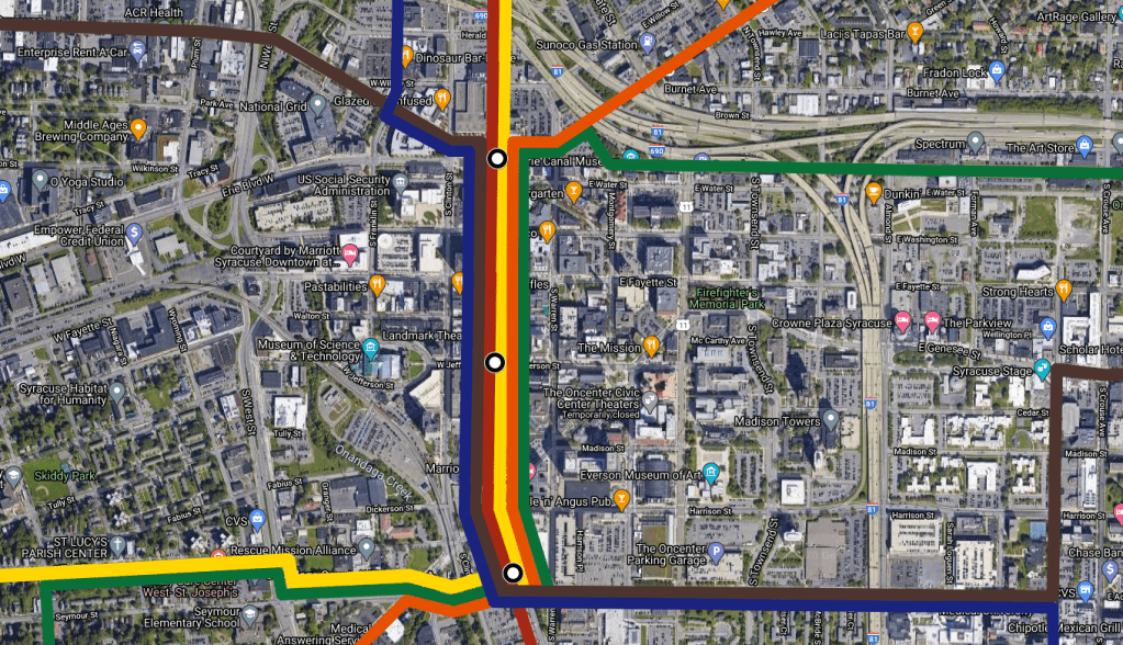 The network effect is what makes transit work. No individual line can be very useful all on its own, but any line gets more useful when it operates in tandem with another line. Every single line in a network gets more useful every time another one gets added to the network. That’s why Centro takes such pains to facilitate transfers at the Hub, and it’s why when Syracuse starts running BRT it should build out as many lines as quickly as possible.